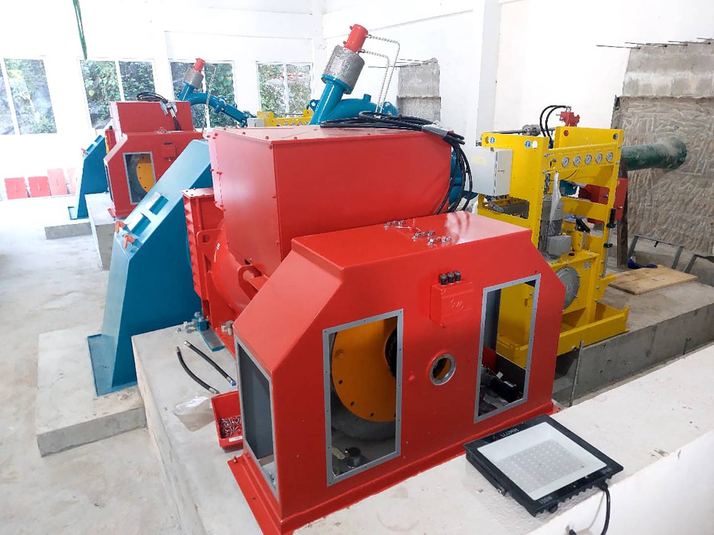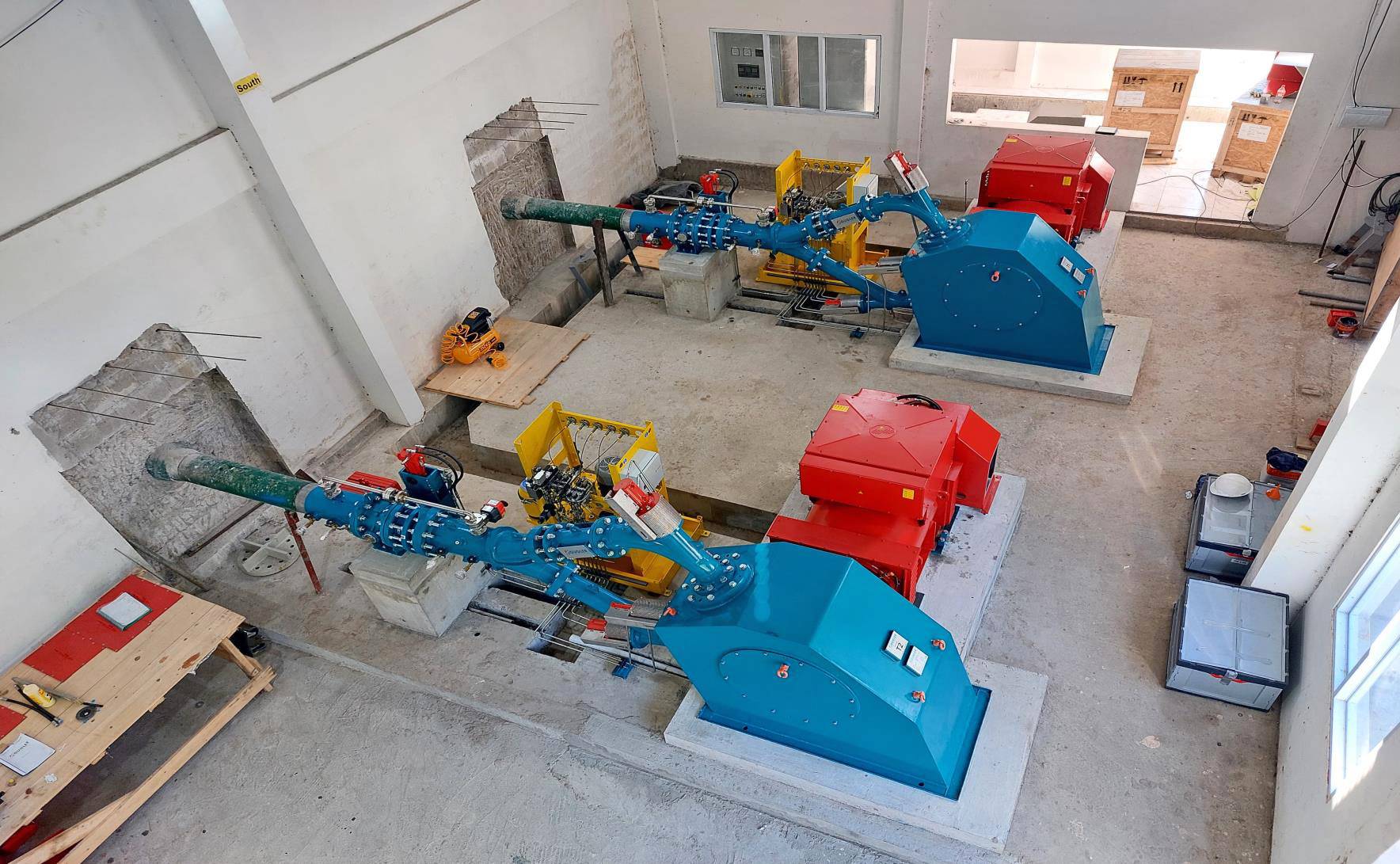 Um aus dem variierenden Wasserdargebot der beiden Flüsse ein Maximum an Effizienz zu erzeugen, setzt GEA bei beiden Kraftwerken auf individuell maßgeschneiderte Pelton-Turbinen in horizontalachsiger Bauweise. Ein wichtiger Punkt bei der Konstruktion der Turbinen war zudem deren Inselbetriebsfähigkeit, um die autarke Stromversorgung der Region abzusichern. Diese Ausführung war mit etwas erhöhtem technischem Aufwand verbunden, da die Lastspitzen im Netz durch eine äußerst kurze Reaktionszeit der Maschinen ausgeglichen werden müssen. Generell können die auf vergleichsweise geringe Durchflüsse und große Fallhöhen ausgelegten Pelton-Turbinen ihre Stärken sowohl unter Volllast, als auch in einem breiten Teillastbereich ausspielen. Während beim Kraftwerk Kumu eine einzelne, auf 360 l/s und 523 m Fallhöhe ausgelegte Maschine Strom erzeugt, setzt man beim Kraftwerk Moco Moco auf eine doppelte maschinelle Lösung. Für diese Anlage wurden zwei identische Turbinen gefertigt, die auf jeweils 220 l/s Ausbauwassermenge und 207 m Fallhöhe ausgelegt sind. Aufgrund der höheren Durchflussmenge und der Kombination mit einer weitaus größeren Fallhöhe erreicht die Turbine des Kraftwerks Kumu bei vollem Zufluss 1.678 kW Engpassleistung. Auch die Leistungsfähigkeit der Kraftwerks Moco Moco ist nicht zu unterschätzen, dort erzielen die Turbinen jeweils fast 400 kW maximale Leistung. Vervollständigt werden die drei Maschinensätze durch direkt mit den Laufrädern gekoppelte Synchron-Generatoren vom italienischen Branchenexperten Marelli Motori, der aus guten Gründen als Spezialist bei der Umsetzung maßgeschneiderter und hochwertiger Lösungen im Wasserkraftbereich geschätzt wird. Das Unternehmen beruft sich auf mehr als 130 Jahre Erfahrung und ist bekannt für die Fertigung zuverlässiger Maschinen, die sich durch beste Wirkungsgrade und eine gleichbleibend hohe Leistungsfähigkeit über viele Betriebsjahre hinweg auszeichnen. Für die Kraftwerke in Guyana lieferte Marelli Motori luftgekühlte Maschinen mit Wälzlagerungen und automatischen Nachschmiereinrichtungen, die durch den Einbau von zusätzlichen Schwungrädern für die Inselbetriebsfähigkeit der Kraftwerke ausgelegt wurden.