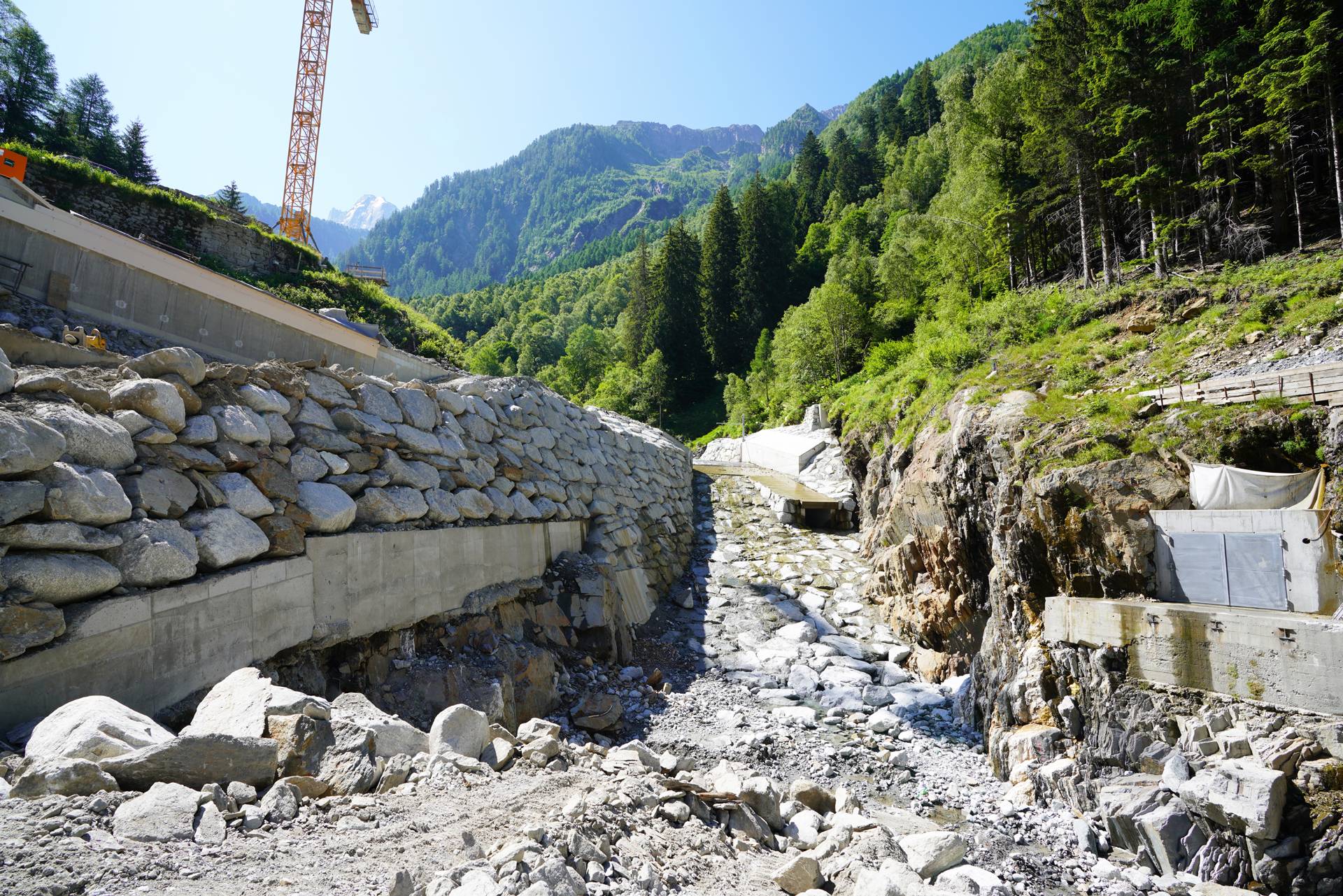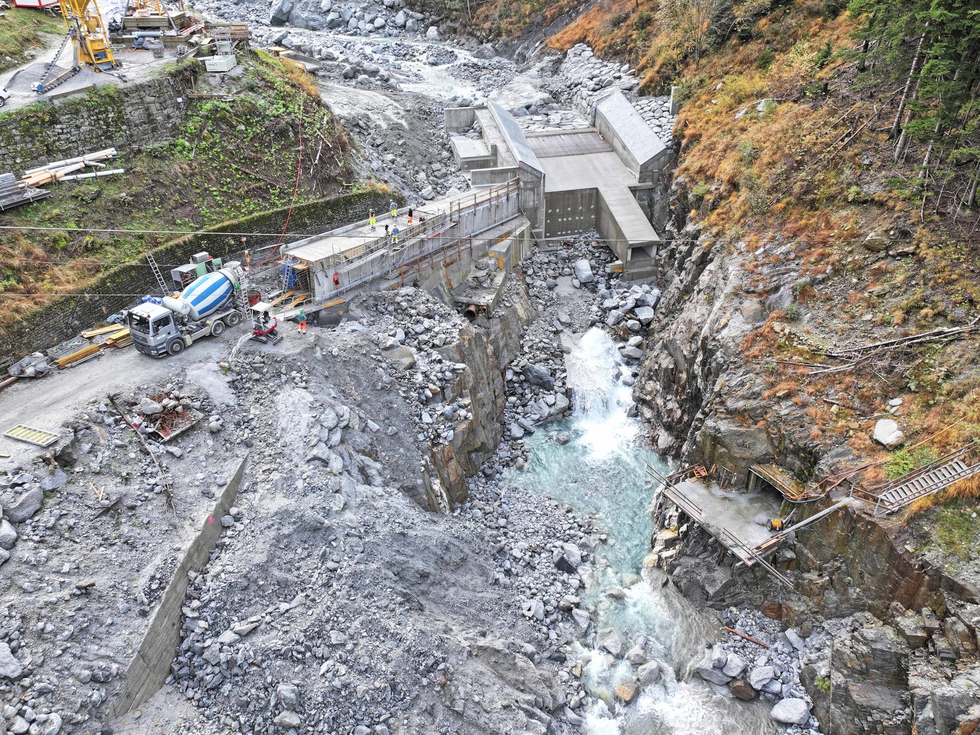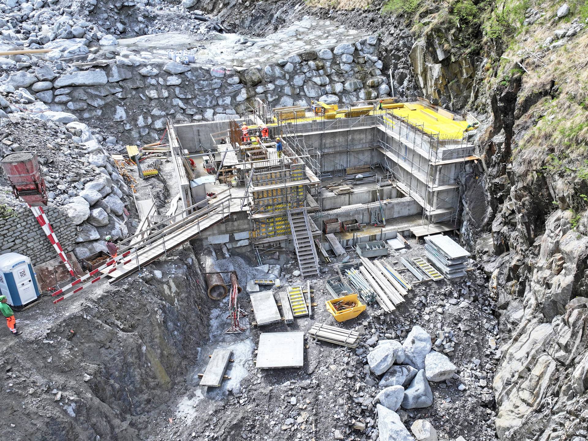 Im Juli 2023 fuhren erstmalig wieder Bagger in Prä auf, die Umsetzung des Bauvorhabens konnte beginnen. In der Folge waren die Arbeiten generell geprägt von den geologischen Unsicherheiten, schwierigen Witterungsverhältnissen und hohem Zeitdruck. Doch erneut war es ein massiver Murgang, der den Kraftwerksbetreibern und dem beauftragten Bauunternehmen heftiges Kopfzerbrechen bereiten sollte. Eine weitere Naturkatastrophe mit gravierenden Folgen: „Die Arbeiten verliefen zunächst planmäßig bis zum August 2023. Gerade als wir den ersten Magerbeton setzen wollten, überraschte uns eine gewaltige Mure, die das gesamte Baufeld verschüttete und bereits errichtete Strukturen teils erheblich beschädigte. Die Schäden waren massiv und warfen das Projekt um Monate zurück“, erinnert sich der Leiter für den Bereich bauliche Kraftwerksinstandhaltung Graubünden, Peter Jörimann, der das Bauprojekt verantwortlich leitete. Wie Jörimann betont, seien bis Dezember 2023 sämtliche Kapazitäten auf die Instandsetzung konzentriert gewesen – das bedeutete vor allem die mühsame Entfernung der Schuttmassen und die Wiederherstellung der provisorischen Bachumleitung, bei welcher das Wasser der Bondasca in zwei großen Rohren unter der Baustelle hindurch geleitet wurde. Erst Ende Januar 2024 konnten die eigentlichen Bauarbeiten unter günstigen Witterungsbedingungen – mit ungewöhnlich wenig Schnee – wieder aufgenommen werden. Dass die Baustelle gegen Naturereignisse versichert war, erwies sich als entscheidend: Zwar gestalteten sich die Verhandlungen mit der Versicherung zäh, doch die Auszahlung war für den Weiterbau unverzichtbar.